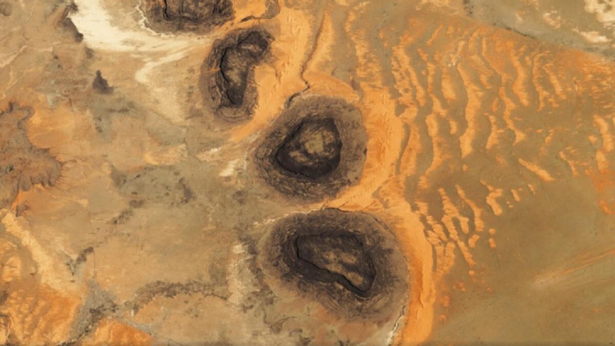Як повідомляє Indian Defence Review, ці об'єкти є реліктами палеозойської ери, що існували ще 541–252 мільйони років тому. Знімок, зроблений з Міжнародної космічної станції, демонструє три майже ідентичні пагорби, обрамлені смугами піску. Їхня головна особливість – насичений чорний колір, який різко контрастує із золотисто-червоними дюнами навколо.