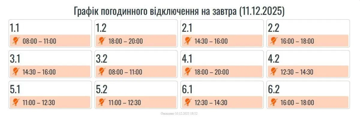 У четвер, 11 грудня, по всій території України будуть застосовуватися графіки відключення електроенергії. Про це офіційно повідомило «Укренерго». Низка обленерго оприлюднила орієнтовні обсяги відключення струму (кількість черг, які можуть бути вимкнені одночасно):
