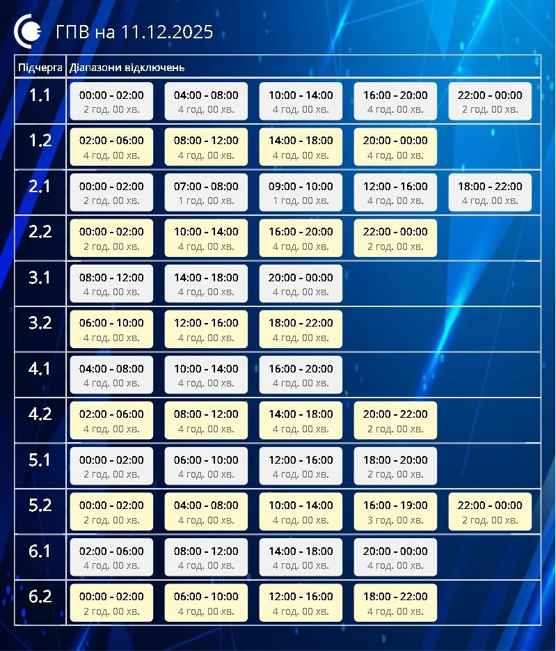 - 04 Графіки відключення світла на Дніпропетровщині 11 грудня