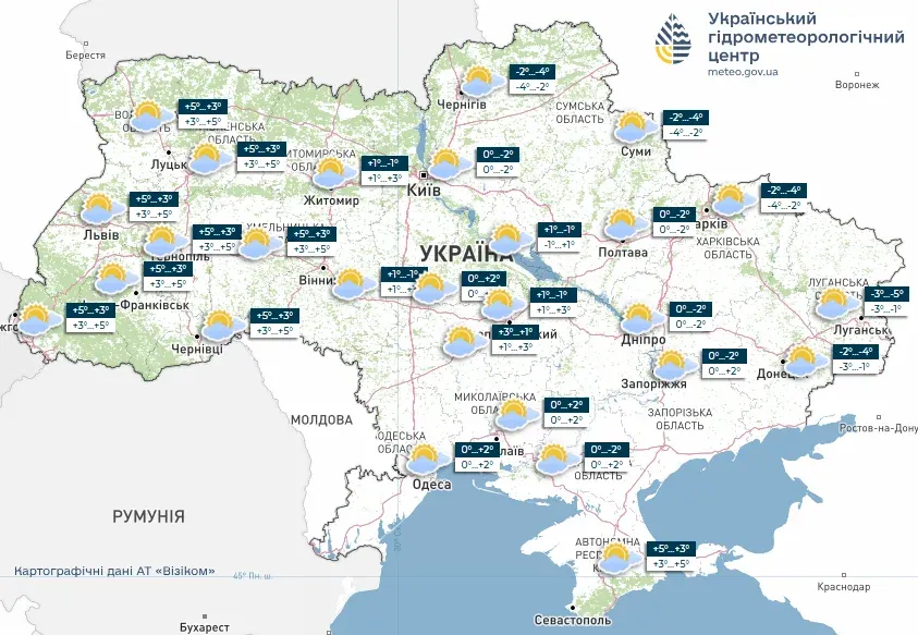 - У східних областях хмарно з проясненнями, без опадів. Нічна температура повітря від - 2 до - 4 градусів, денна від 0 до - 3 градусів.