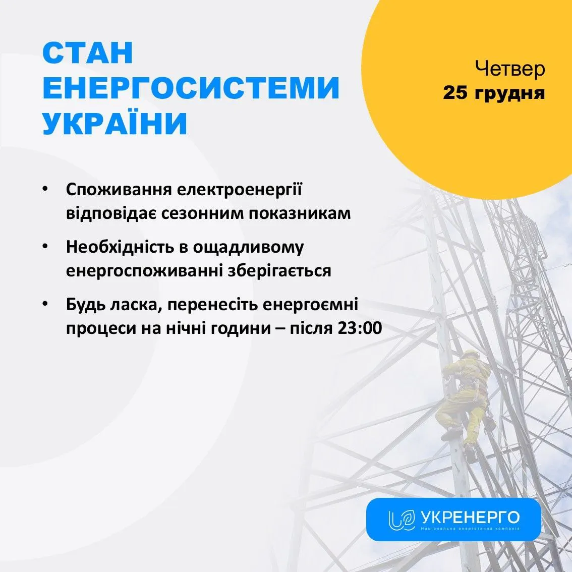 Добовий максимум 24 грудня був на 6,6% вищим, ніж попереднього дня, через менше обмежень і похолодання. Усі споживачі повинні обмежувати користування енергоємними приладами.