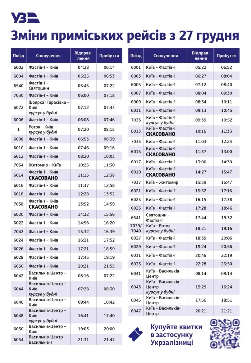 Крім того, з 27 грудня тимчасово не курсують п’ять найменш населених денних приміських рейсів. Водночас рух у напрямку Києва, Козятина, Житомира, Боярки, Білої Церкви, Миронівки, Тарасівки, Славутича та Чернігова збережено.