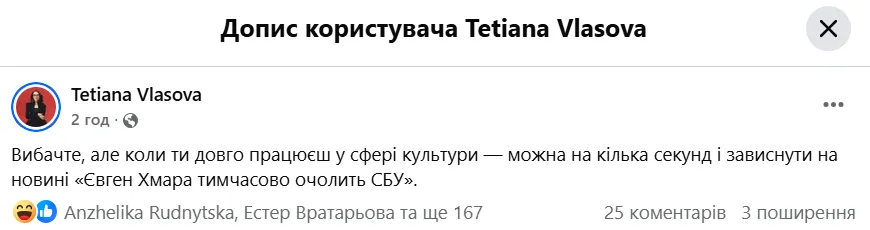 «Вибачте, але коли ти довго працюєш у сфері культури - можна на кілька секунд і зависнути на новині «Євген Хмара тимчасово очолить СБУ».
