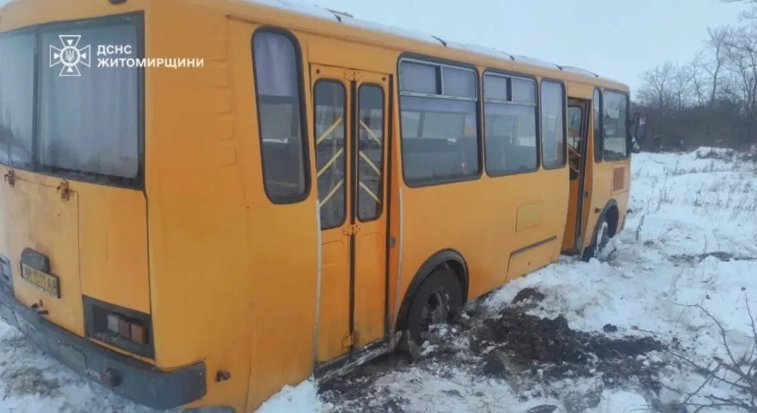 А на Житомирщині, поблизу села Мала Горбаша, рейсовий автобус із пасажирами застряг у снігу. У салоні перебували 15 пасажирів. Самостійно вибратися з переметів водій не зміг, тож на місце прибули фахівці ДСНС України.