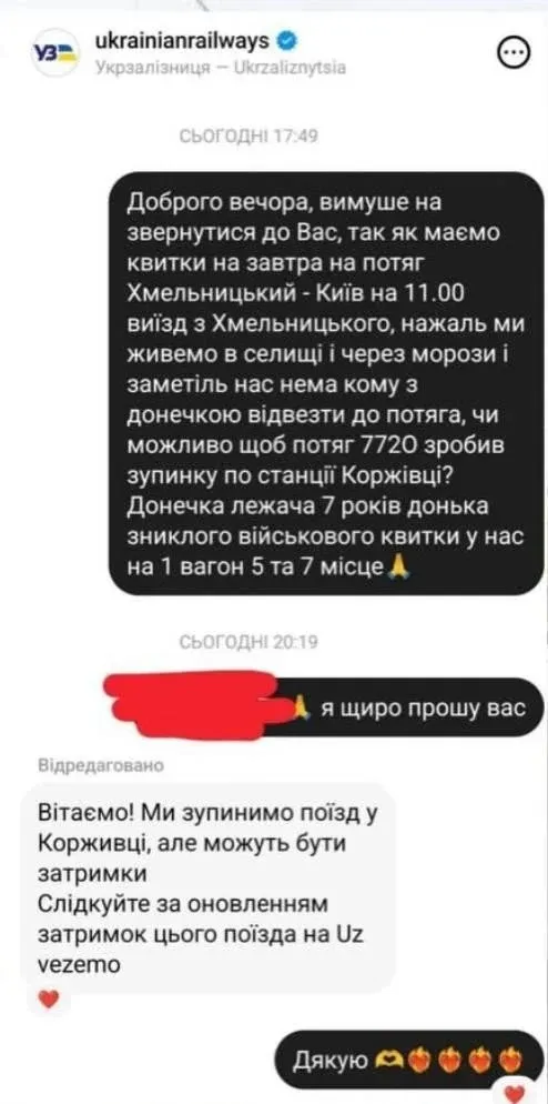 У компанії швидко відреагували на звернення та погодили зупинку на найближчій станції поблизу села, де проживає родина. Посадка минула без ускладнень, а працівники залізниці допомогли жінці з дитиною. Також родині передали невеликий подарунок на знак підтримки.
