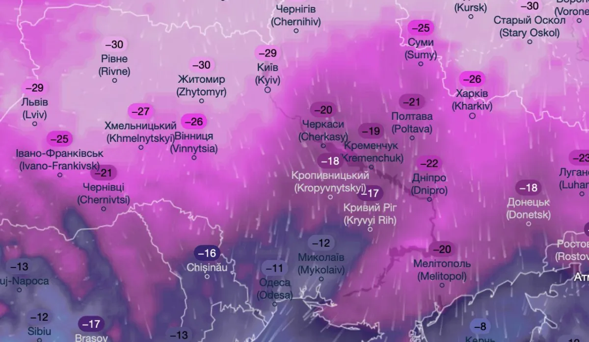Найнижчі температури прогнозують у північних регіонах України, а також у Києві та області. У нічні та ранкові години стовпчики термометрів можуть опускатися до -30 градусів або близьких значень.
