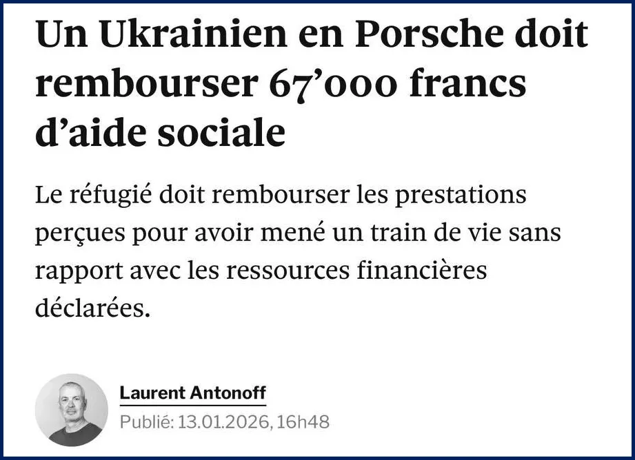 У швейцарському кантоні Во українського біженця зобов’язали повернути 67 тисяч франків (≈ €72 тисячі) соціальної допомоги. Причина – спосіб життя, який не відповідав заявленому фінансовому стану.