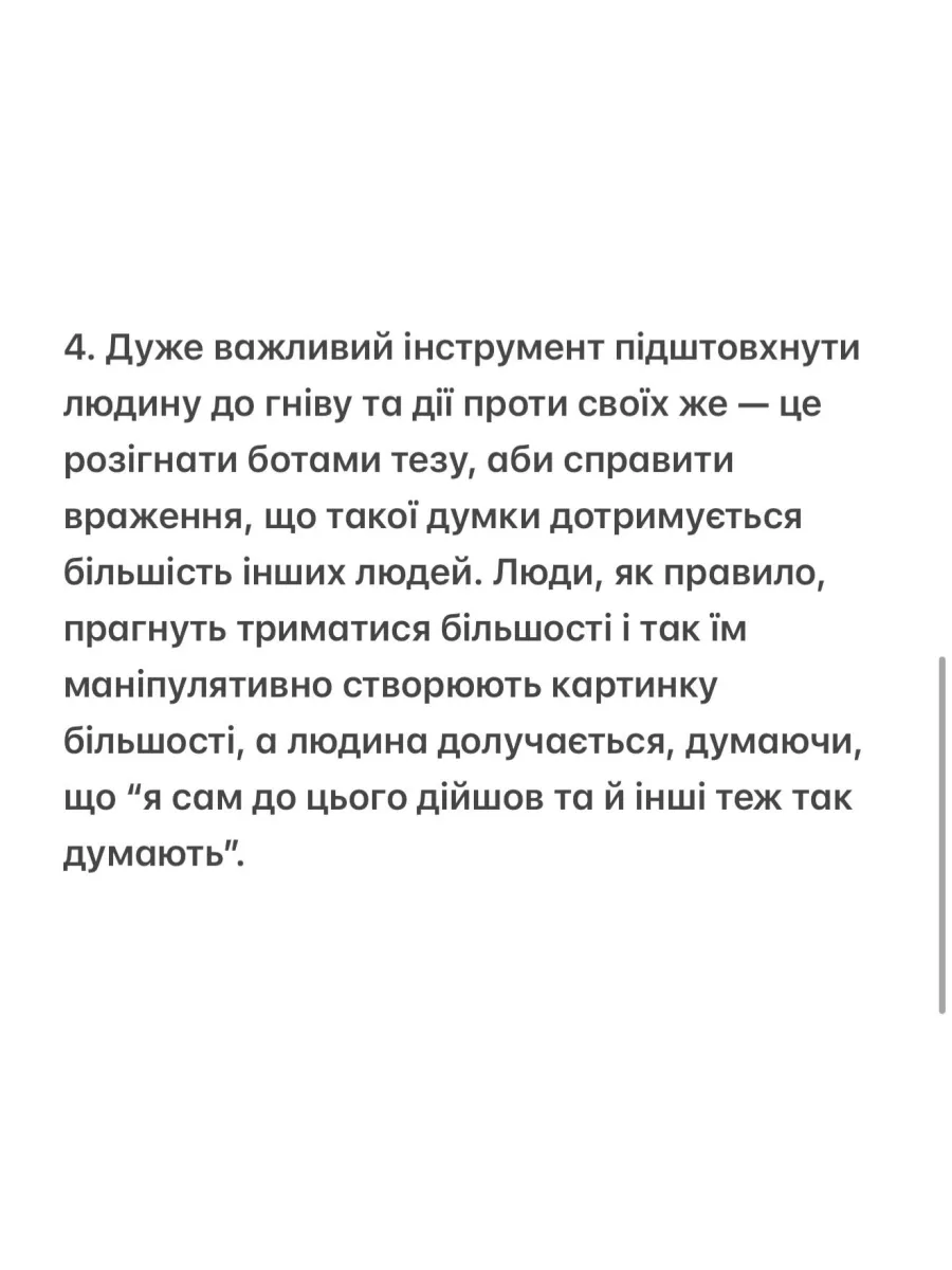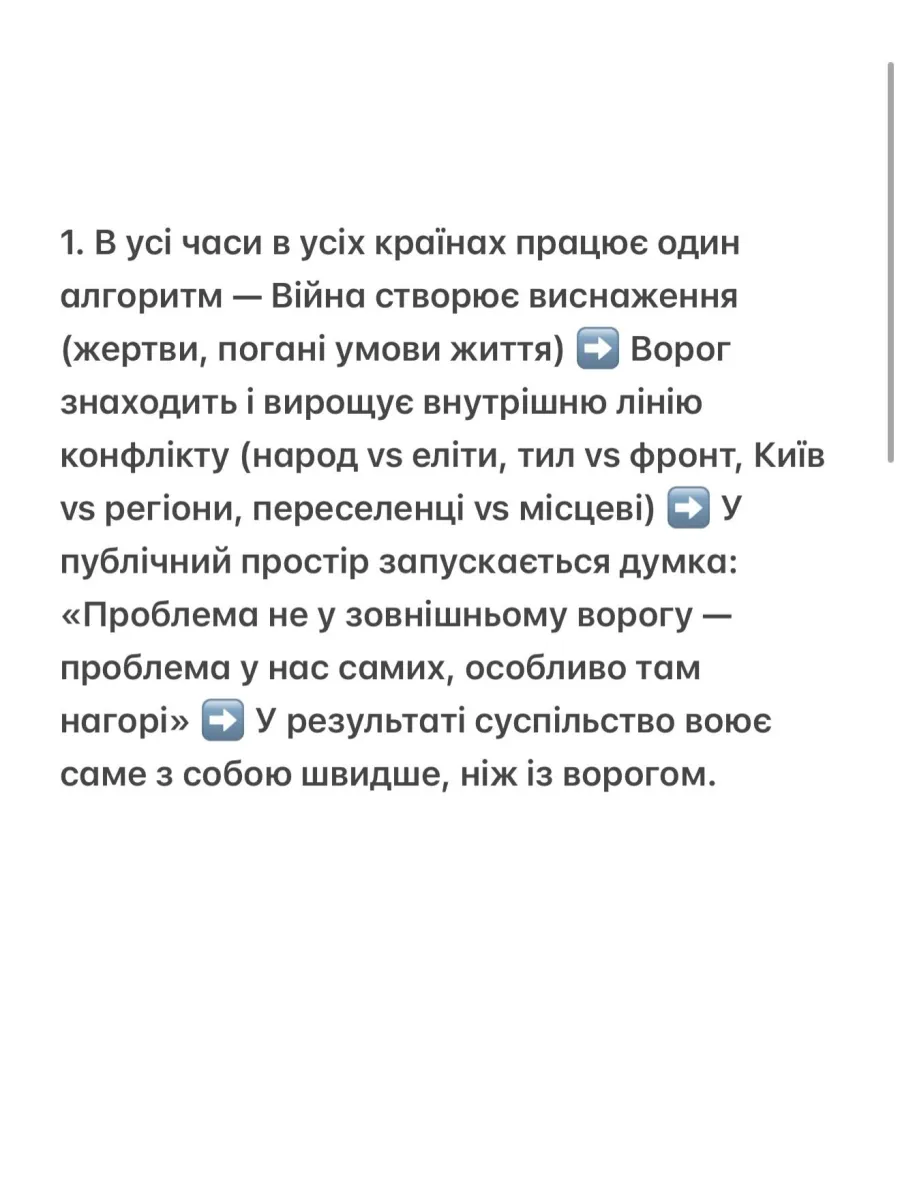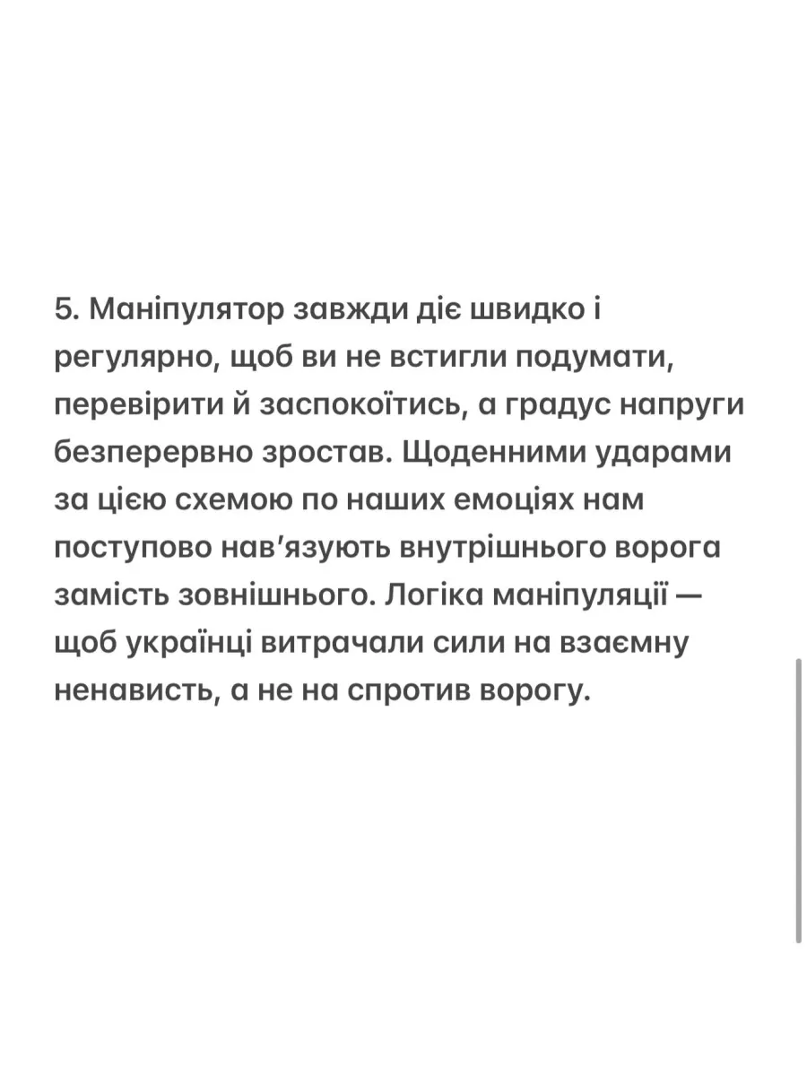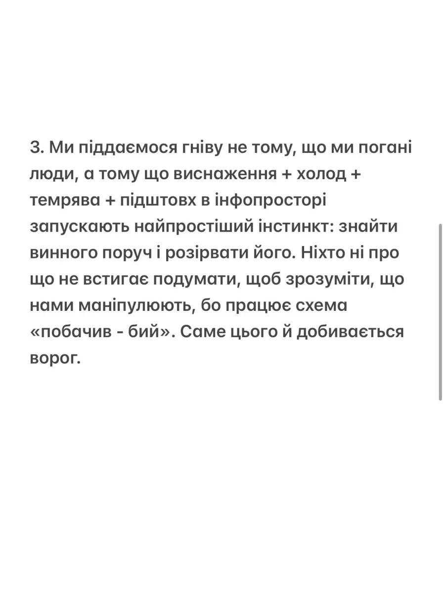 Кулеба пояснив, що маніпуляції ворога часто ґрунтуються на використанні емоцій і створенні внутрішнього ворога. Він порадив українцям зупинитися перед тим, як піддаватися гніву й нагадати собі, що будь-яке повідомлення, яке змушує ненавидіти співвітчизників більше, ніж ворога, працює на користь Росії.