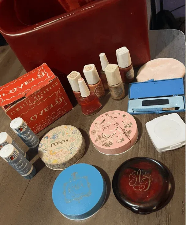 Авторка допису описала запах знахідки як аромат багатої літньої дами з легким відтінком плісняви. У численних відділеннях та кишенях сумки зберігся повний набір косметики минулої епохи: пудра, рум'яна, засоби для брів, губні помади й навіть лак для нігтів.