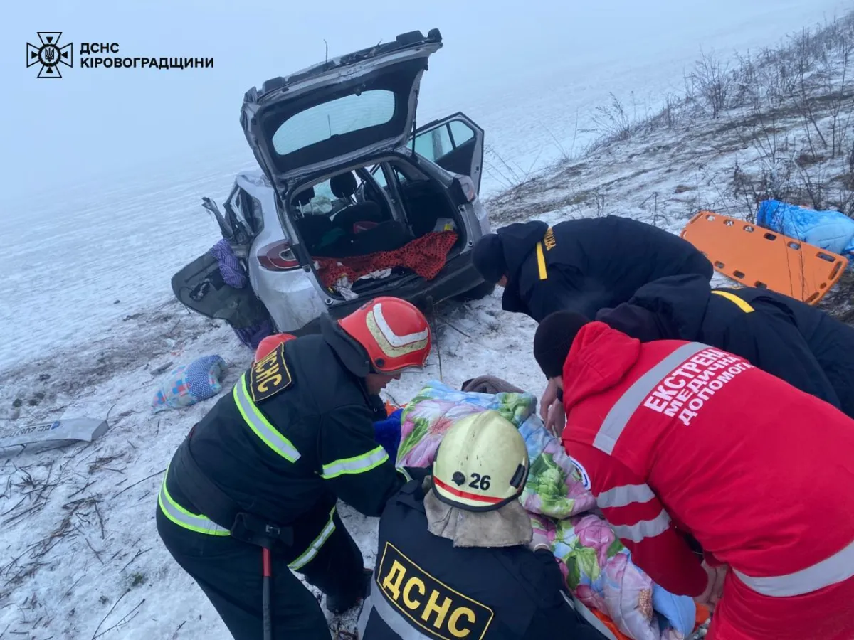 Рятувальники ДСНС дістають з пошкодженої машини постраждалих. Фото: ДСНС Кіровоградщини