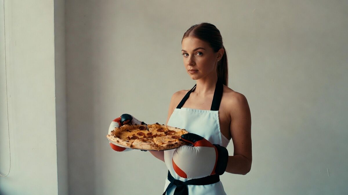 Дівчина з біцепсами навпроти піцерії. Фото: BLIK.ua, згенероване засобами ШІ