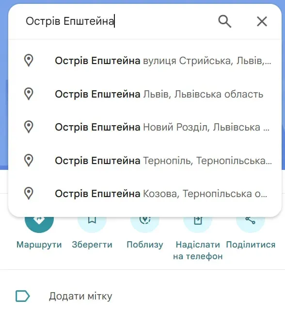 У Львові на Google Maps з’явилася геомітка з назвою «острів Епштейна» в районі вулиць Стрийської та Наукової. Про це повідомили користувачі соцмереж, звернувши увагу на дивну і провокаційну назву локації. Даний матеріал опублікував 24 канал. Вже на момент публікації мітка була видалена з сервісу.