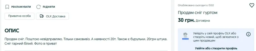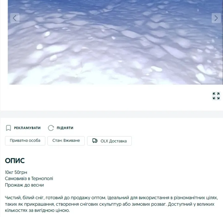 У Тернополі чоловік продає сніг та бурульки. І це не жарт. Звісно, якщо оголошення на платформі онлайн оголошень OLX, розміщене там кілька днів тому не розіграш.