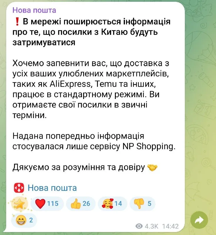 «Хочемо запевнити вас, що доставка з усіх ваших улюблених маркетплейсів, таких як AliExpress, Temu та інших, працює в стандартному режимі. Ви отримаєте свої посилки у звичні терміни», – зазначили у компанії.