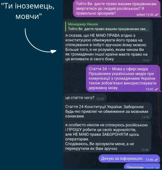 Амбер звернувся до оператора з проханням говорити українською, оскільки це для нього було принциповим. Проте, після відмови оператора, він вирішив звернутися до Медвідя. Однак, на його скаргу Медвідь відповів, що не має права обмежувати право співробітника на спілкування тією мовою, якою йому зручно.