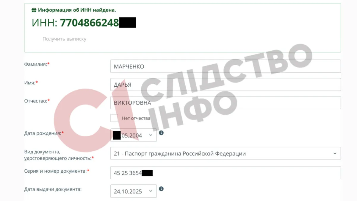 За даними журналістського розслідування, паспорт РФ дівчина отримала 24 жовтня 2025 року в Москві. Про це повідомляє slidstvo.info.
