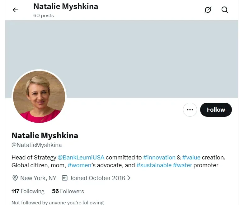 Актуальніші відомості про Мишкіну містяться у її візитівці на сайті консалтингової компанії C-Vision International, датованій листопадом 2024 року. З неї випливає, що нині вона працює в Adobe фахівчинею з бізнес-інновацій, стратегії та управління ризиками. Зазначається, що раніше вона обіймала посади віцепрезидентки й директорки у банках Societe Generale Group і Leumi USA, а також набувала консалтингового досвіду в McKinsey & Company.