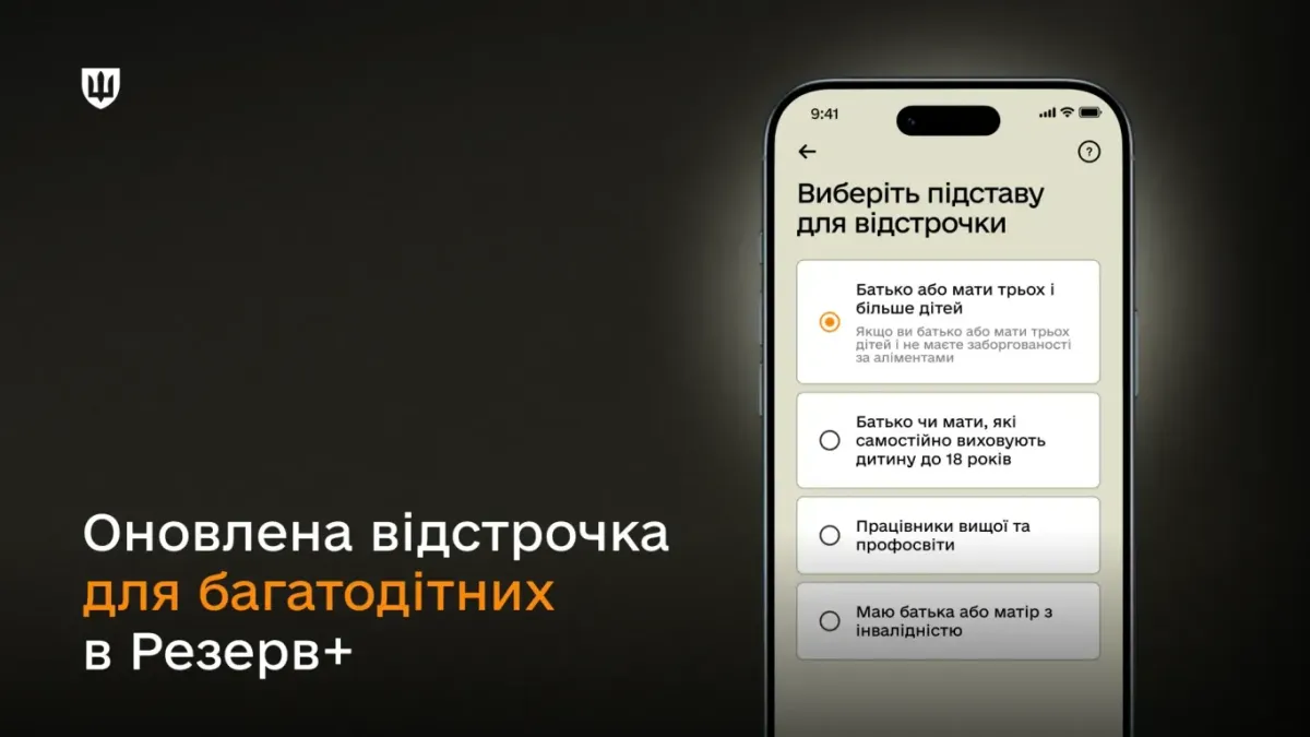 У рамках оновлення застосунку Резерв+ тепер будь-який військовозобов’язаний батько, який має трьох чи більше дітей до 18 років, може подати запит на відстрочку без довідок чи паперових заяв. Це рішення розширює доступ до онлайн-відстрочок і робить процедуру максимально зручною та доступною для громадян.