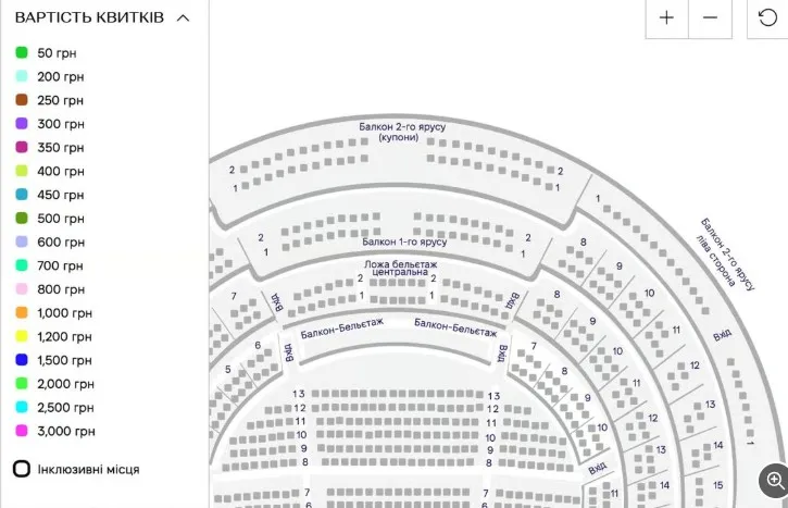 Найдоступніші місця збоку на балконі коштували 50 гривень, проте їх розкуповували майже миттєво. Решта місць на балконі продавалися до 400 грн, тоді як ложі, партер та центральні ряди обходилися значно дорожче.