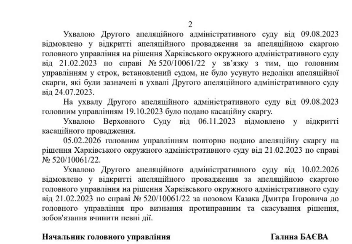 Казак отримує пенсію з 2018 року після оформлення інвалідності. Уже у 2022-му він через суд домігся перерахунку виплат за старою нормою - 80% від зарплати. Апеляцію подали із запізненням у 21 день і без квитанції про судовий збір, що стало ключовою причиною провалу.