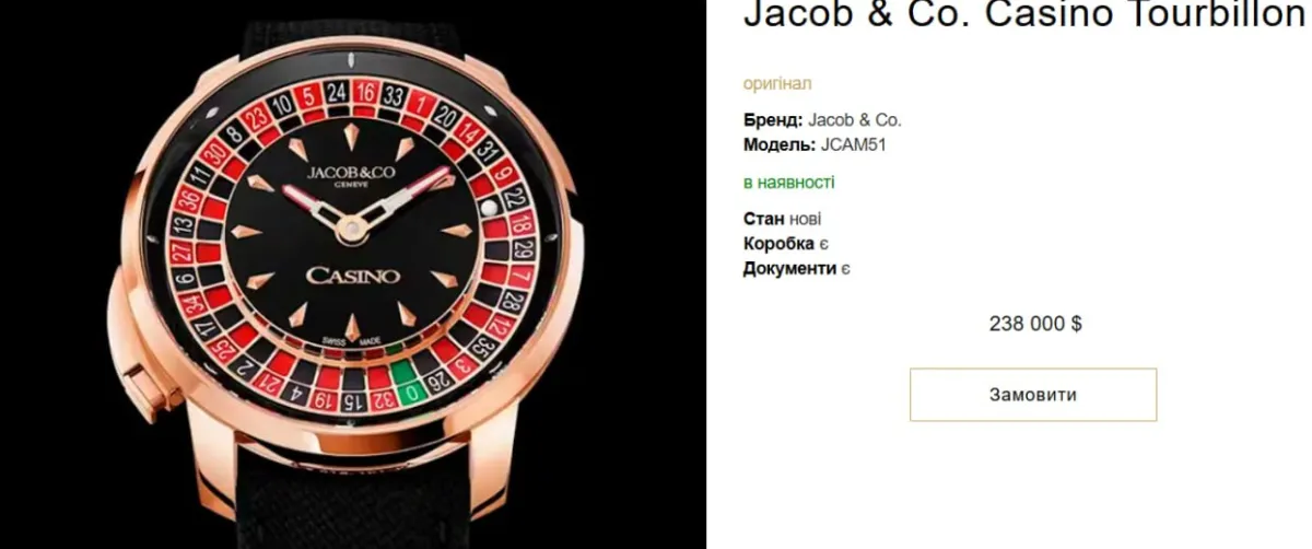 Йдеться про модель Jacob & Co Casino Tourbillon - один із найексклюзивніших годинників у світі. Його особливість - циферблат у стилі рулетки та складний механізм турбійона. Це робить його не просто прикрасою, а символом статусу та розкоші.