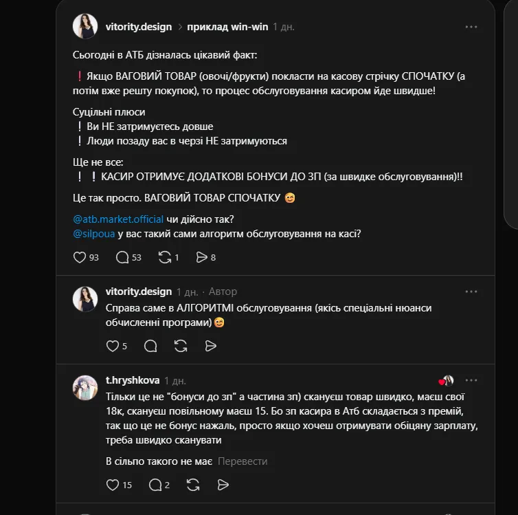 Авторка вже звернулася до офіційних акаунтів мережі «АТБ», щоб дізнатися, чи справді такий алгоритм обслуговування використовується на їхніх касах.