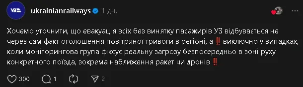 Компанія наголошує: евакуація пасажирів відбувається не через сам факт тривоги, а лише тоді, коли моніторингова група фіксує реальну загрозу на маршруті – наближення ракет чи дронів.