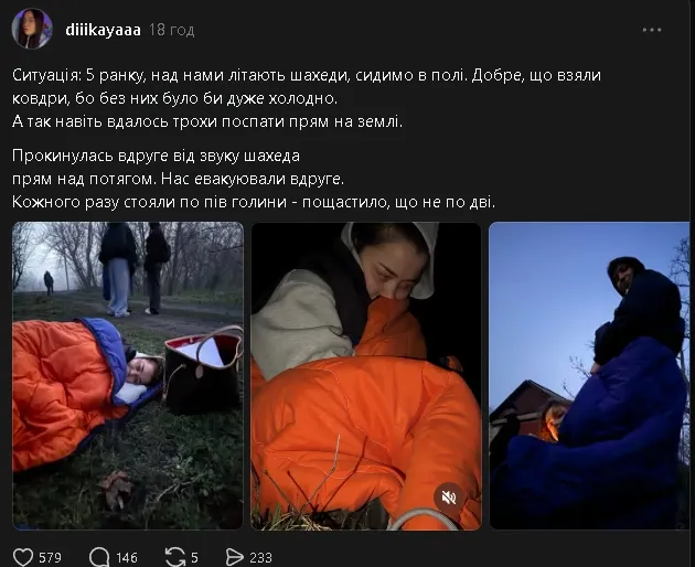«5 ранку, над нами літають шахеди, сидимо в полі… добре, що взяли ковдри», – пише одна з пасажирок, яку евакуювали двічі за ніч.