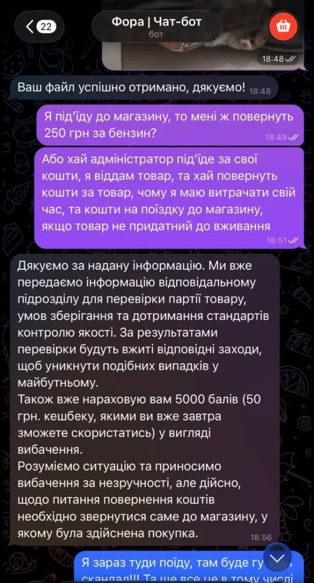 «Магазин фора @fora.market , годують людей сирим мʼясом, 14.04 придбав курча табака в магазині в черрі Молл! Дома виявляється, що курка сира!!! В підтримці мені пропонують поїхати в магазин за коштами, але хто поверне гроші за бензин 250грн?», – написав користувач.