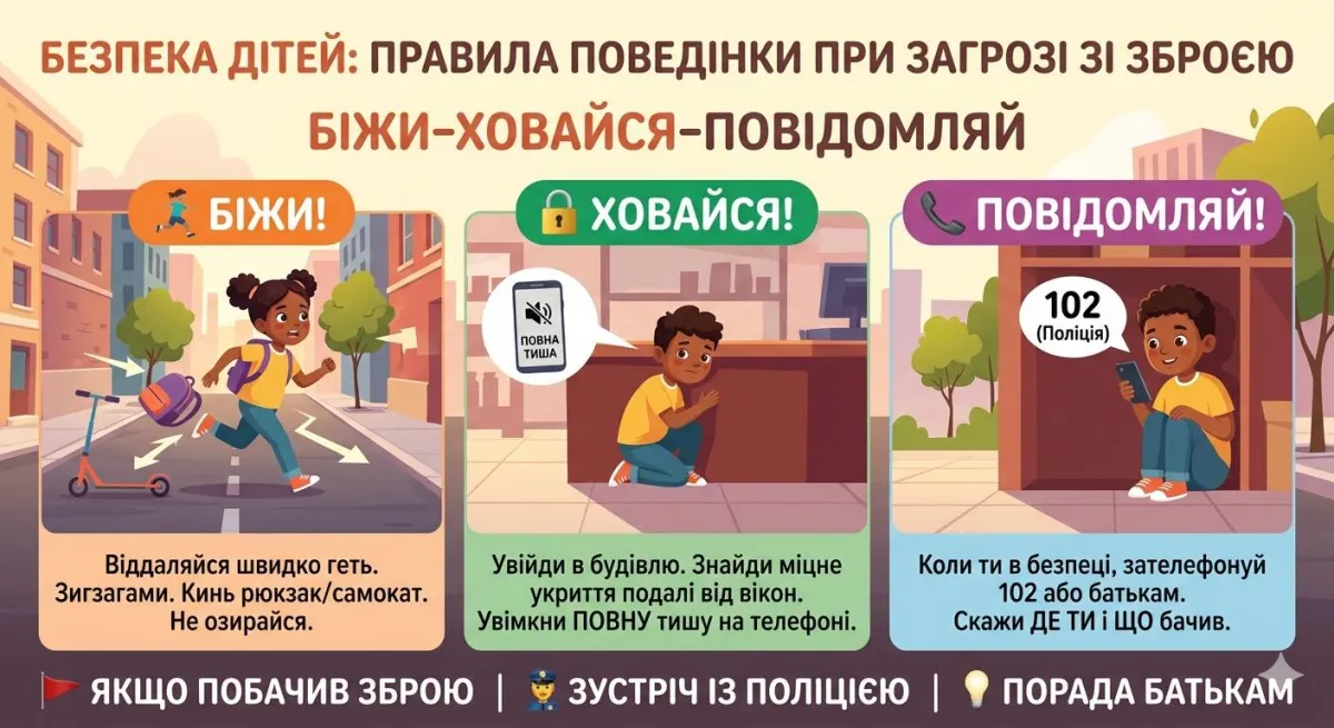 «Біжи-ховайся-повідомляй»: експерт назвав поради для дітей у випадку стрілянини