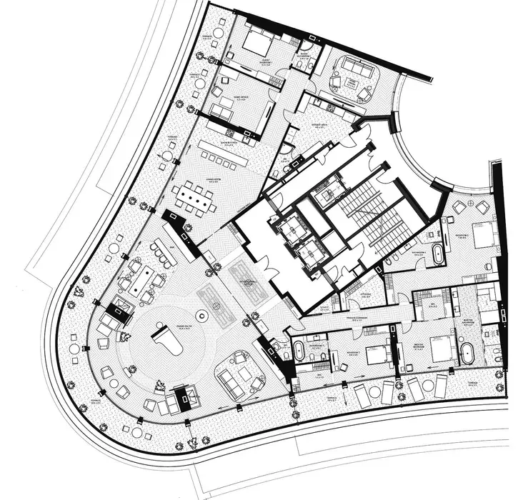 Квартира пропонується без ремонту у форматі вільного планування, проте технічна складова вражає: власна вентиляція, система очищення повітря і води, підвищена шумоізоляція, приватний вхід для персоналу та два-три паркомісця у підземному паркінгу. Кухня займає 45 квадратних метрів, кожна спальня має власний санвузол.