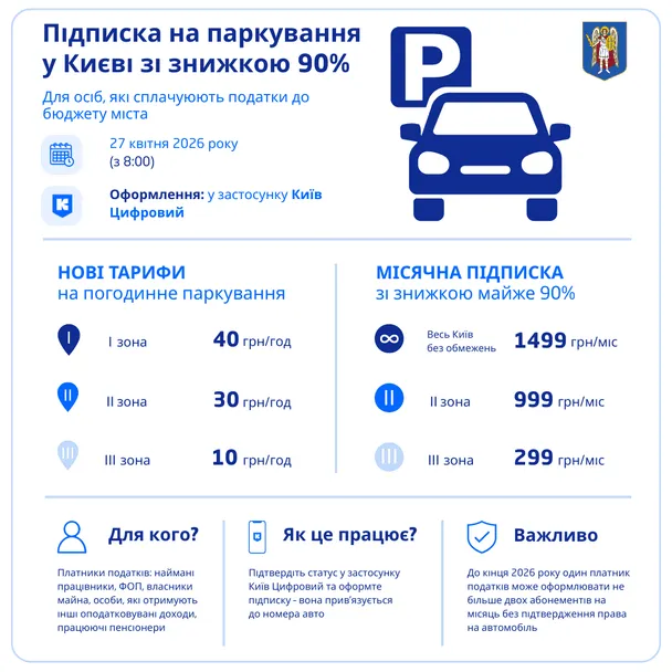 Завдяки такій новій послузі, кияни, які сплачують податки до бюджету столиці, зможуть оформити абонемент на паркування з неймовірною знижкою до 90%.