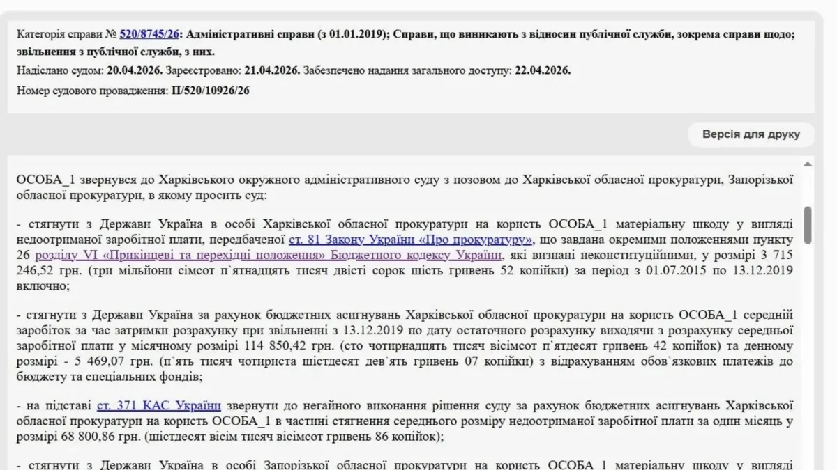 Харківський окружний адміністративний суд залишив позов без руху через процесуальні неточності. Зокрема, Казак пропустив строки подання - звернутися до суду потрібно було одразу після звільнення у 2024 році. Тепер йому необхідно просити поновлення строків позовної давності. У матеріалах справи зазначено: