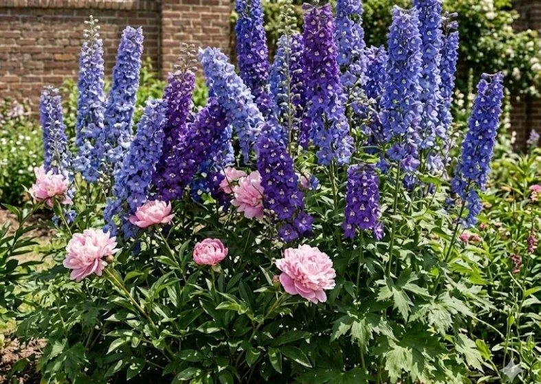 Ці красені теж не дружать. Півоніям життєво необхідне сонце і гарне провітрювання куща. Дельфініуми ж виростають дуже високими та просто закривають півонії від світла. Окрім того, дельфініуми дуже жадібні до води, тому слабше коріння півонії часто залишається ні з чим.