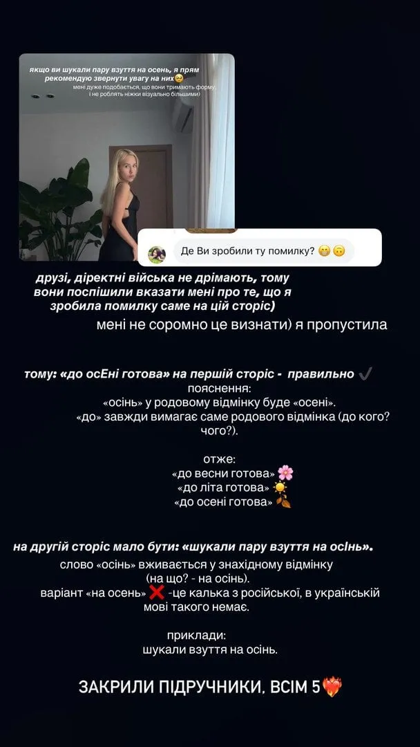 «Друзі, діректні війська не дрімають, тому вони поспішили вказати мені на помилку. Мені не соромно це визнати. Слово «осінь» вживається у знахідному відмінку. Варіант «на осень» – це калька з російської. Приклад: «шукали взуття на осінь». Згорнули підручники, всім 5», – додала блогерка.