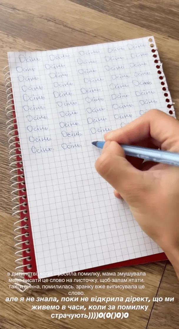 «У дитинстві, коли я робила помилку, мама змушувала мене писати це слово на листочку, щоб запам’ятати. Так, я винна, помилилася. Зранку вже виписувала це слово, але я не знала, що ми живемо в часи, коли за помилку страчують», – з гумором написала вона.