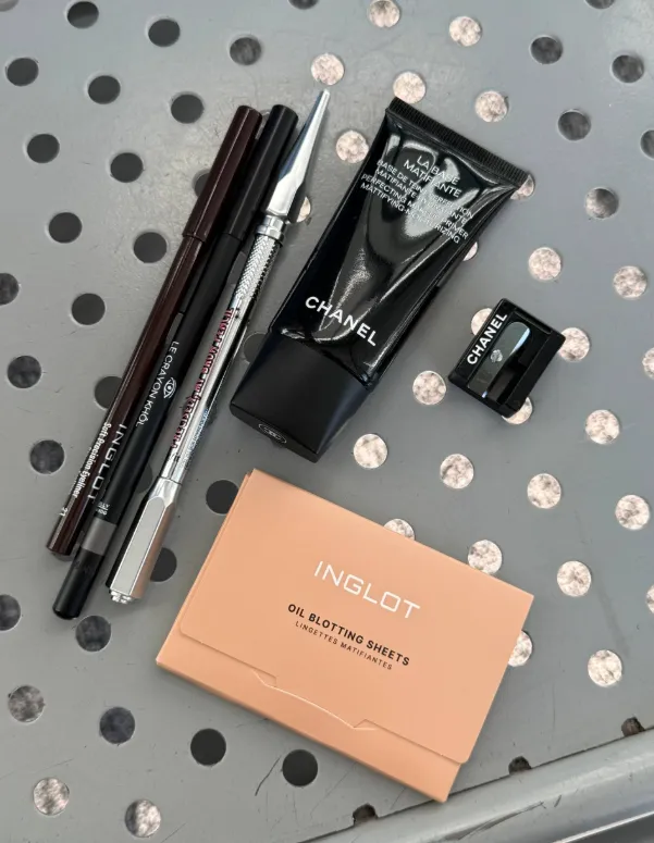 Хоча базу під макіяж раніше не використовувала, Дорофєєва вирішила придбати основу Chanel з матовим ефектом (1800 грн). Справжній must-have у її сумці – матуючі серветки від Inglot (500 грн).