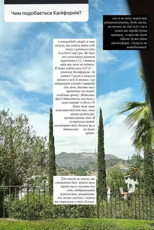 «Це було моє незалежне рішення переїхати в 15, і дитяча мрія, яка мене не підвела. Я дуже люблю південну Каліфорнію. За майже 5 років я пожила майже у всіх її містах, і це найкращий клімат і природа для мене. Плюс тут море можливостей для тих, кому цікава режисура, продюсування, кіно», – зазначила Злата.
