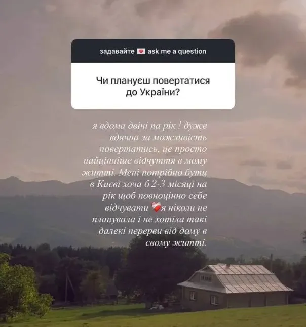 Дівчина наголосила, що наразі повертатися в Україну на постійній основі не збирається, адже відчуває, що перебуває там, де завжди хотіла бути. Водночас вона зізналася, що обов’язково відвідує Київ двічі на рік.
