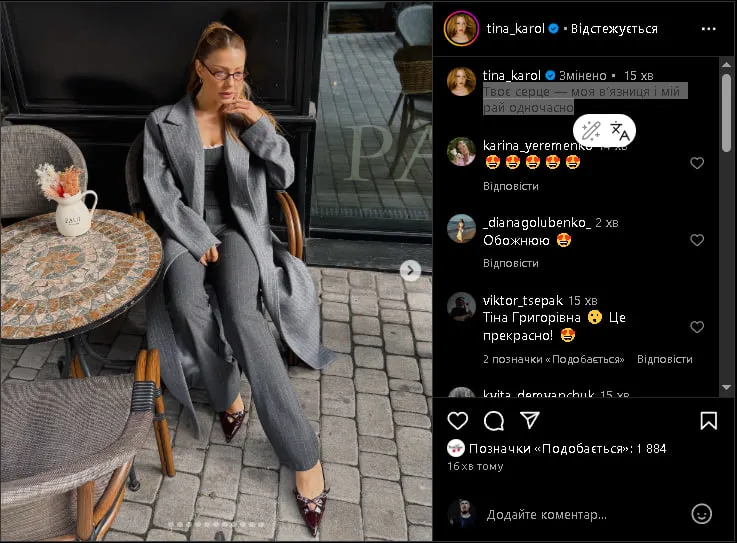 Тіна Кароль відома тим, що часто поєднує у своїх постах естетику та глибокі емоційні підтексти. Її Instagram давно став не лише майданчиком для спілкування з прихильниками, а й своєрідним щоденником, де кожен підпис має символічне значення.