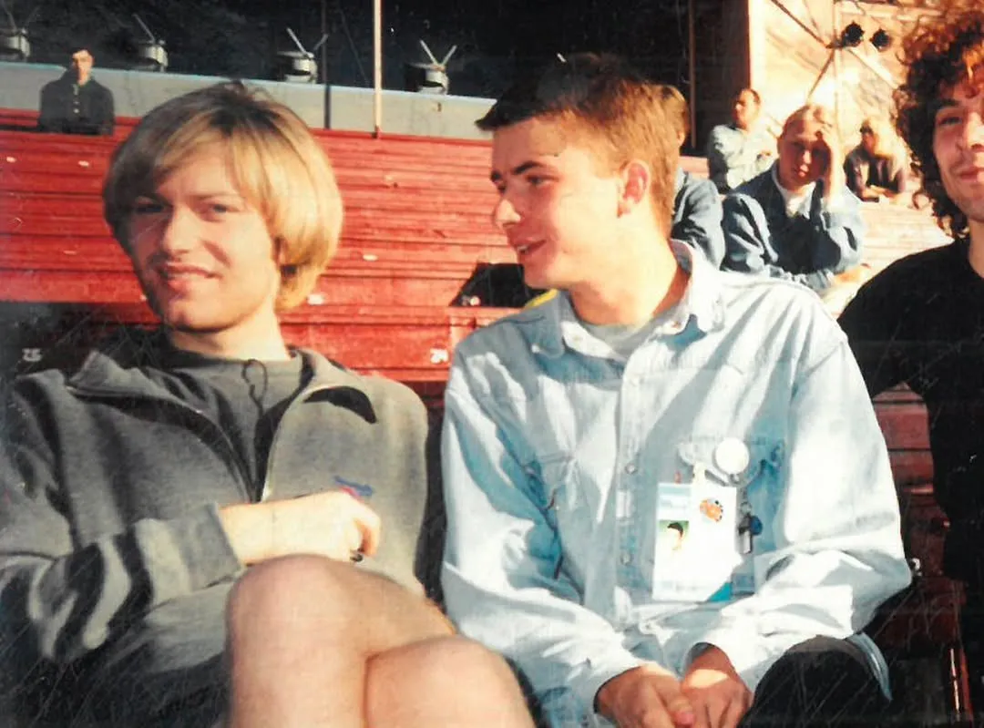 На першому фото Данилко постав з Кравчуком біля сцени. Зірки показалися у досить молодому віці. Данилко сидів на сходах у блакитній сорочці.
