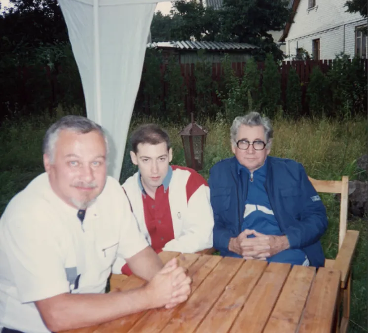 Дмитро Гордон у молодому віці позує у спортивній куртці з біло-червоним орнаментом, поряд із ним – Павло Загребельний у синьому костюмі та темних окулярах. Ліворуч у кадрі – отець Олександр у світлій сорочці.