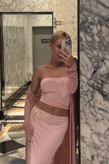Крім того, блогерка постала у костюмі пудрового кольору, який складався з топу та міді-спідниці. Свій образ вона доповнила кофтинкою.