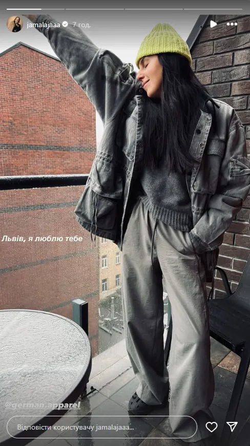 Українська співачка Джамала опублікувала новий знімок зі Львова, який одразу викликав хвилю відгуків серед її прихильників. На фото артистка позує на балконі з видом на дошову вулицю, одягнена у сірий багатошаровий look із вільними штанами, светром та курткою. Яскравим акцентом стала зелена в’язана шапка, яка додала образу свіжості та настрою.