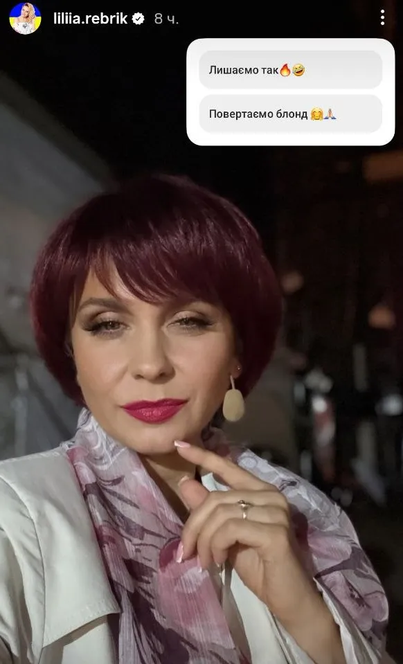Відома українська телеведуча й акторка Лілія Ребрик показала в Instagram Stories радикальну зміну іміджу, з’явившись із короткою зачіскою та незвичним для себе кольором волосся.