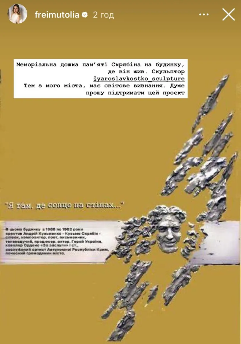 «Меморіальна дошка памʼяті Скрябіна на будинку, де він жив. Скульптор теж з мого міста – Ярослав Костко має світове визнання. Дуже прошу підтримати цей проєкт», – додала ведуча.