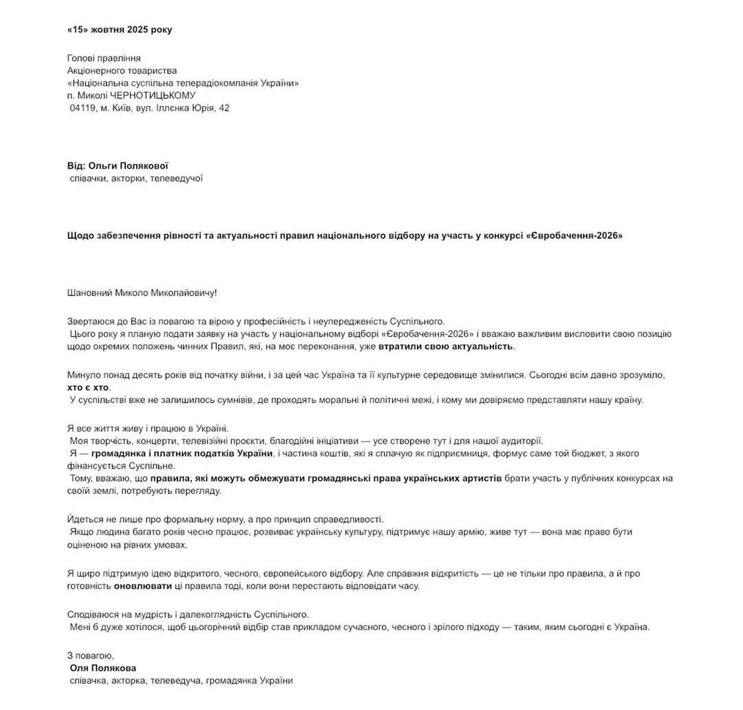 Оля Полякова подала заявку на Нацвідбір Євробачення-2026: співачка вимагає змінити правила конкурсу