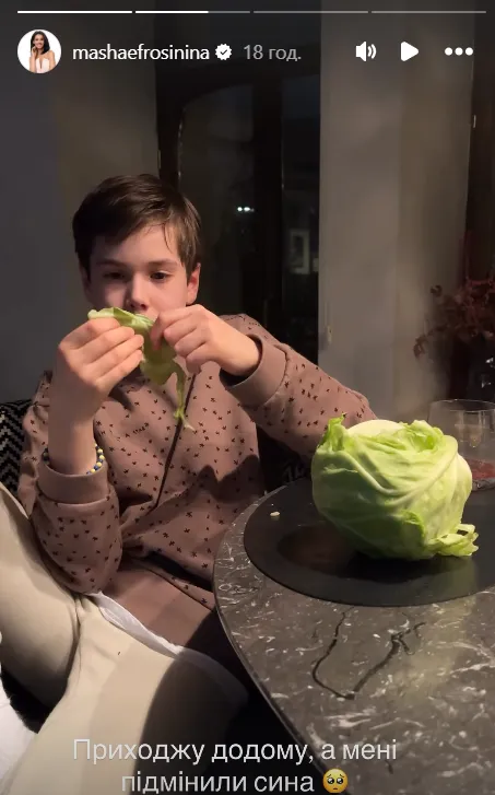 У сторіс в Instagram вона опублікувала відео, на якому її 11-річний син Сашко сидить удома в домашньому одязі й із неабияким задоволенням смакує капусту в сирому вигляді.