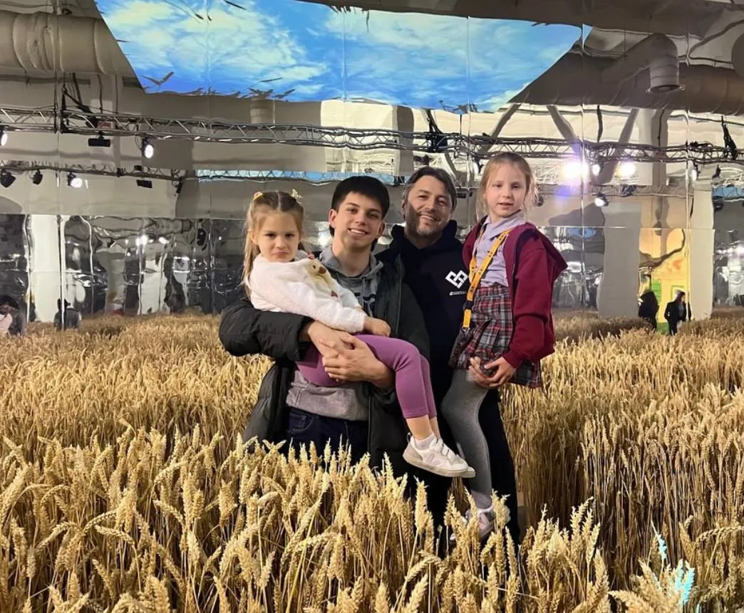 В іншому кадрі він позує із трьома дітьми: Дмитром від першого шлюбу, зовні дорослим і впевненим, поруч із молодшими Соломією та Стефанією. Усі посміхаються, ніби забули про камерний формат заходу.