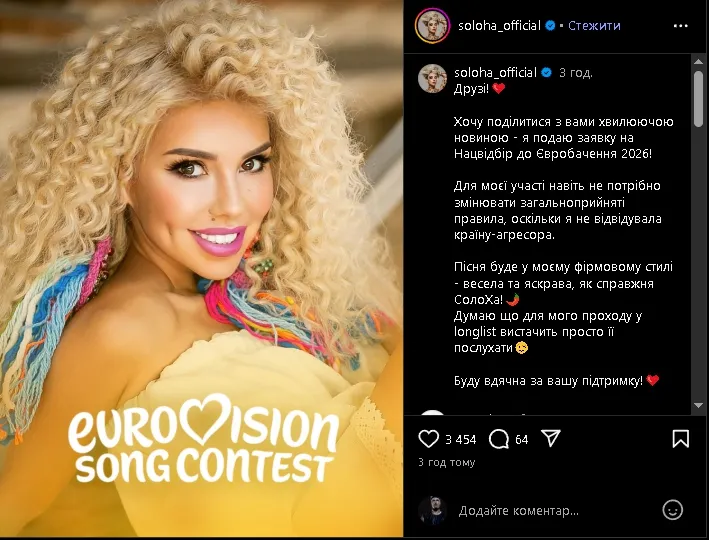Минулого року СолоХа вже пробувала свої сили у відборі, але не потрапила до лонглиста. Цього разу вона налаштована рішуче й закликає прихильників підтримати її.